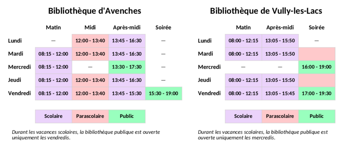 Les deux bibliothèques d’Avenches et Vully-les-Lacs sont ouvertes pendant le temps scolaire et proposent également des ouvertures publiques :